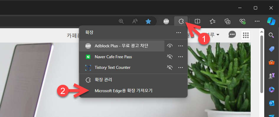 1. 엣지 브라우저에서 확장 아이콘을 클릭하고 Microsoft Edge용 확장 가져오기를 클릭합니다.