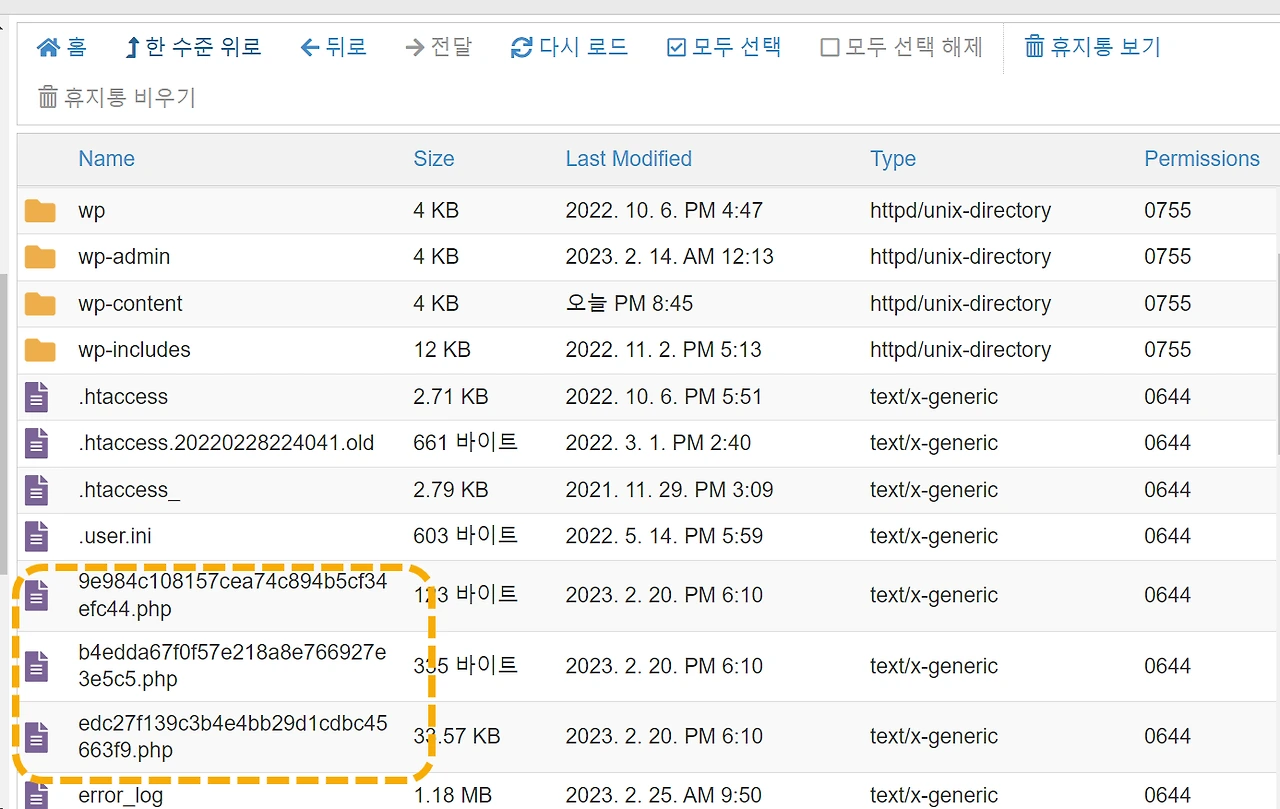 악성코드에 감염될 경우 FTP/SFTP를 통해 서버에 접속하여 살펴보면 이상한 이름의 파일들이 생성되어 있을 수 있습니다.