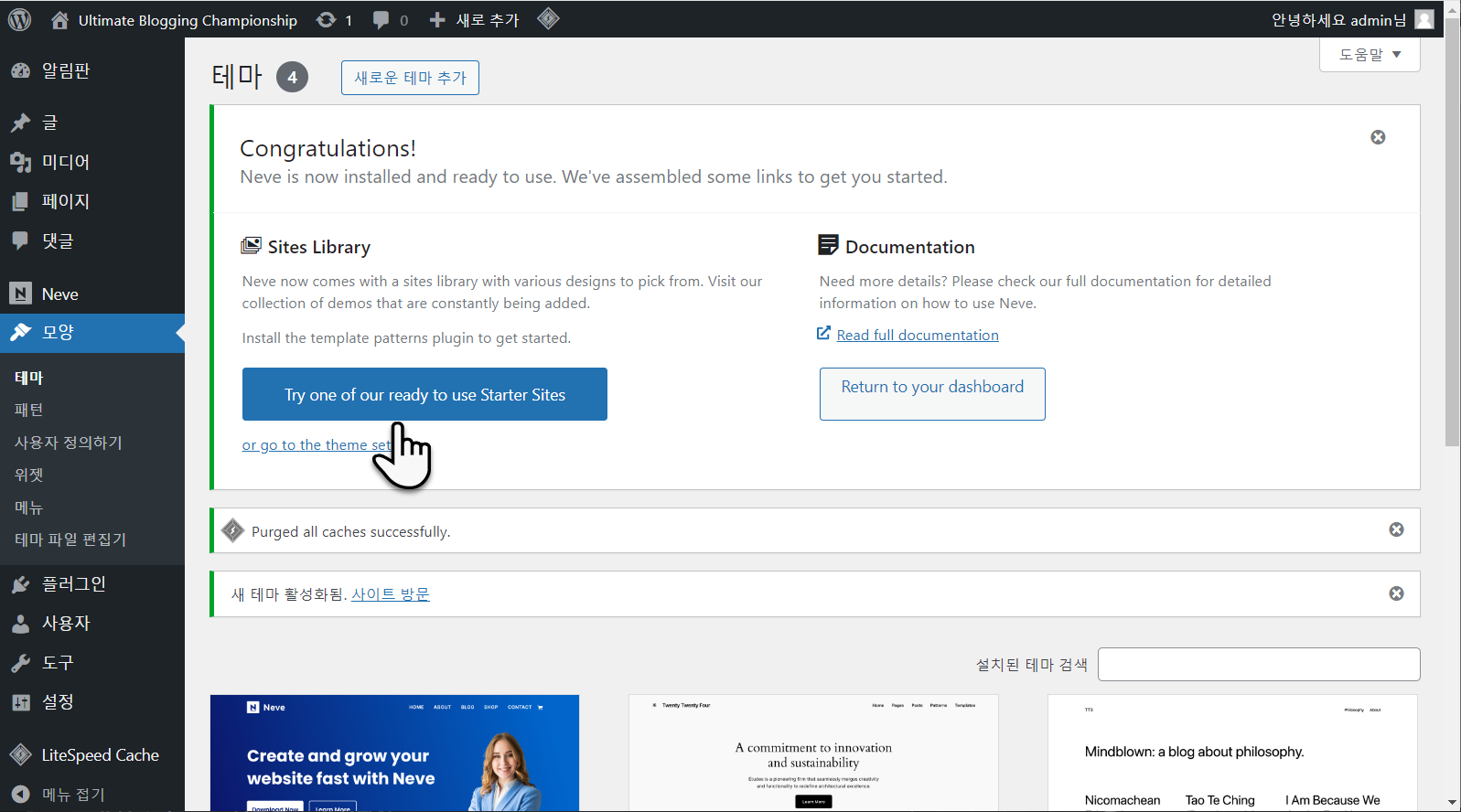 테마를 활성화한 후에 Try one of our ready to use Starter Sites 버튼을 눌러 미리 만들어진 사이트를 확인하고 설치할 수 있습니다.