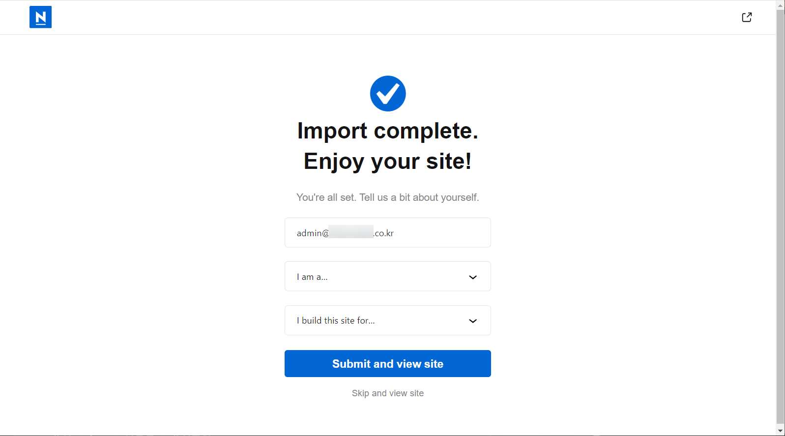 설치가 완료되면 양식을 입력하고 Submit and view site를 클릭하거나 아무것도 입력하지 않고 Skip and view site를 클릭합니다.