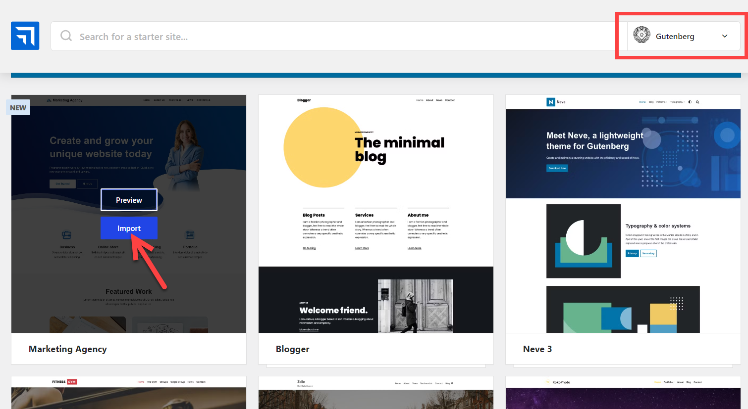 무료 버전을 사용하는 경우에는 Gutenberg를 선택하고 무료 템플릿을 선택할 수 있습니다.