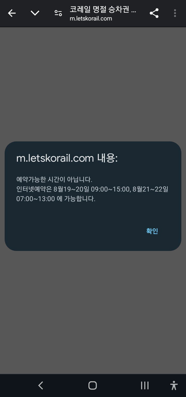 이 문제를 체크해 보니 코레일 서버 시간이 폰의 시간과 맞지 않아서 발생하는 것 같습니다. 코레일 서버 시간은 다음 링크에서 확인할 수 있습니다.