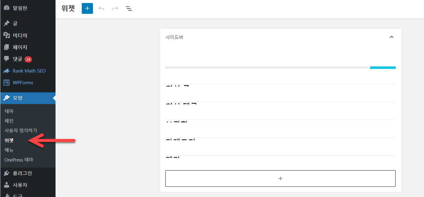 사이드바를 표시하고 싶다면 모양 » 위젯으로 이동하여 사이드바에 적절한 사이드바를 추가하도록 합니다.