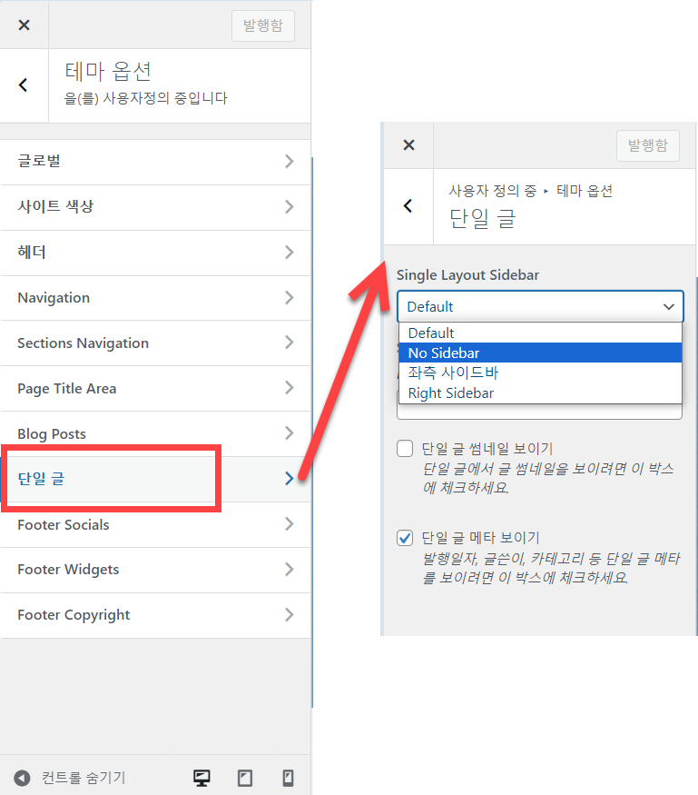 블로그 글만 사이드바를 없애고 싶은 경우에는 테마 옵션에서 단일 글(Single Posts)을 클릭합니다.