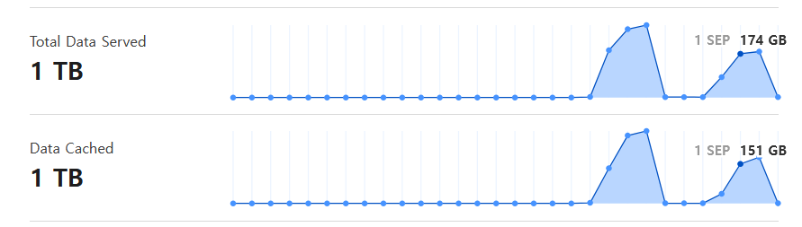 처음 Cloudflare에 도메인을 연결한 후에 사이트 속도가 느려질지도 모른다는 생각에 캐시를 비활성화하였습니다. 하지만 디도스 공격 때 트래픽 사용량을 체크해 보니 한 번의 공격에 200~300GB가 소모되는 것을 확인했습니다. 공격이 지속적으로 발생할 경우 호스팅 요금제에 따라 하루 200~300GB의 트래픽 소모를 감당하지 못할 수도 있습니다.