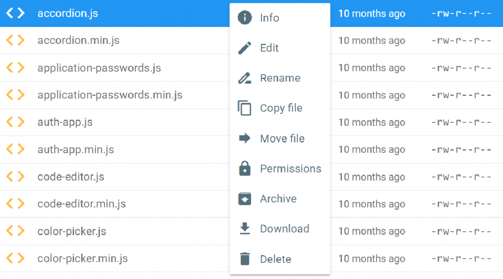 파일 편집(Edit), 이름 변경(Rename), 파일 복사(Copy file), 파일 이동(Move file), 권한 설정(Permissions), 압축(Archive), 다운로드(Download), 삭제(Delete) 등의 작업을 수행할 수 있습니다.