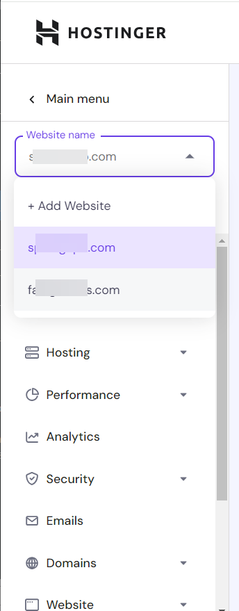 도메인을 변경하고 싶은 경우 왼쪽 상단의 Website name 필드를 클릭하여 다른 도메인을 선택할 수 있습니다.