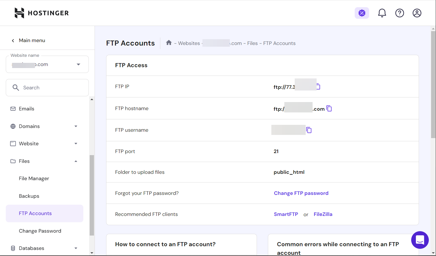 호스팅어에서 FTP를 통해 웹 서버에 접속하려는 경우 FTP 접속 정보를 확인하여 파일질라(FileZilla)와 같은 FTP/SFTP 클라이언트 프로그램을 통해 접속할 수 있습니다.