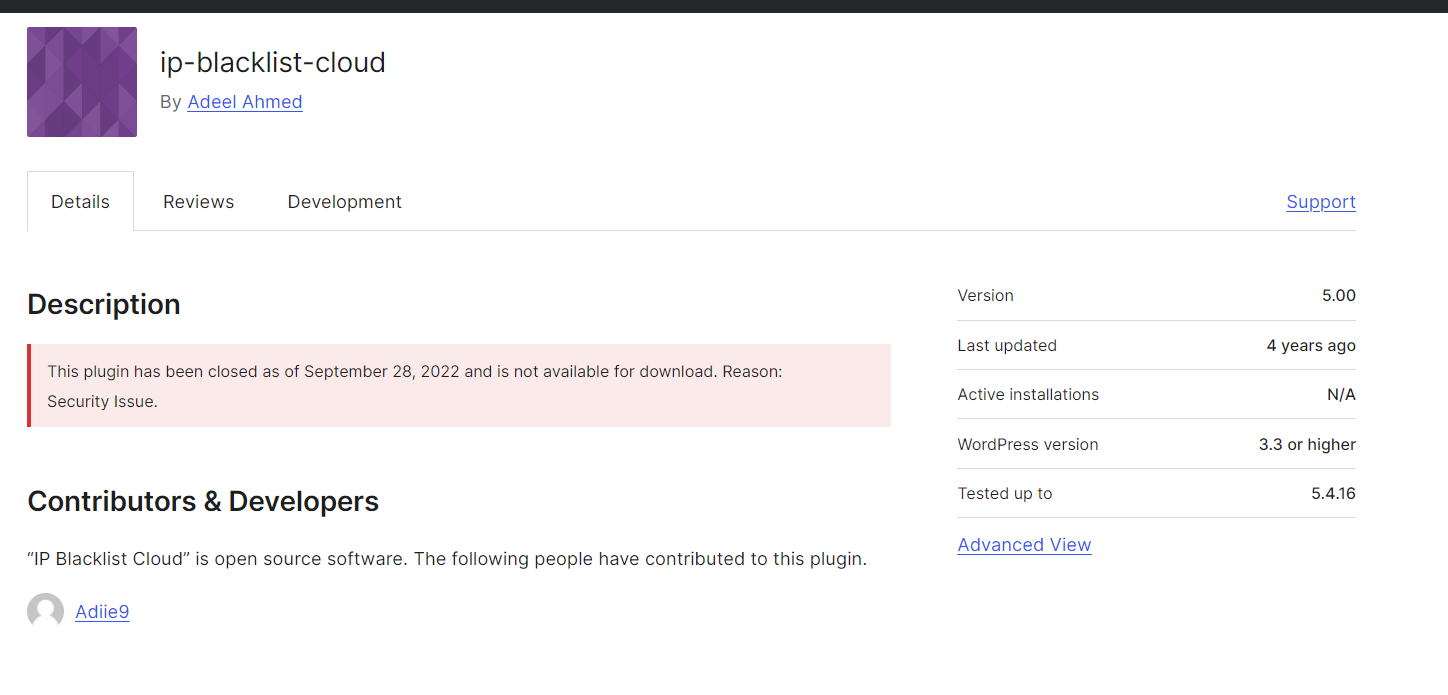 문제의 사이트에 IP Blacklist Cloud라는 플러그인이 설치되어 있었는데, 이 플러그인은 2022년 9월 28일에 워드프레스 플러그인 저장소에서 제거되었습니다.