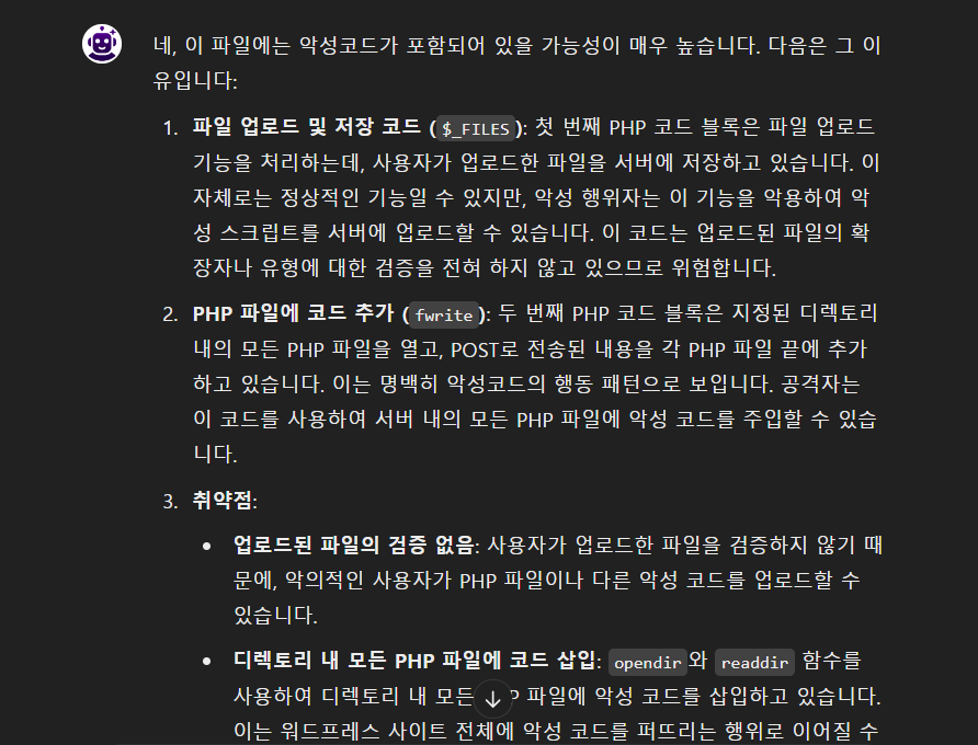 챗GPT에 코드를 넣어서 물어보니 악성코드일 가능성이 높다는 답변을 주네요.