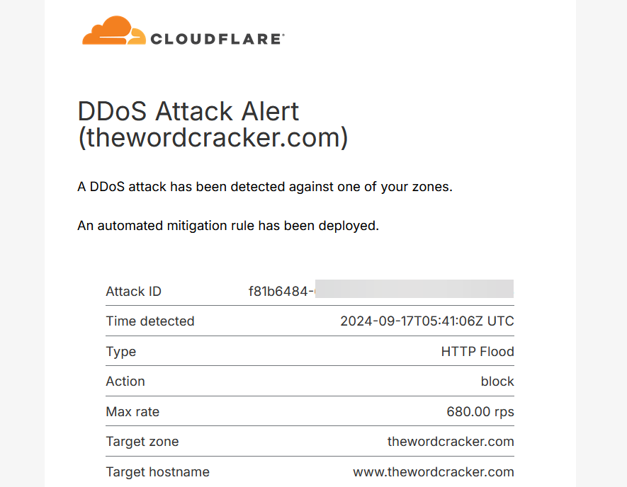 클라우드플레어에서 디도스 공격 알림을 설정하면 디도스 공격이 감지될 경우 이메일을 통해 알림이 전송됩니다.