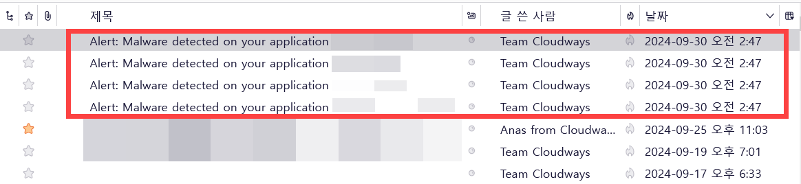 지난 9월 30일 클라우드웨이즈(Cloudways)에서 애플리케이션에서 멀웨어가 감지되었다는 메일 네 통을 받았습니다.