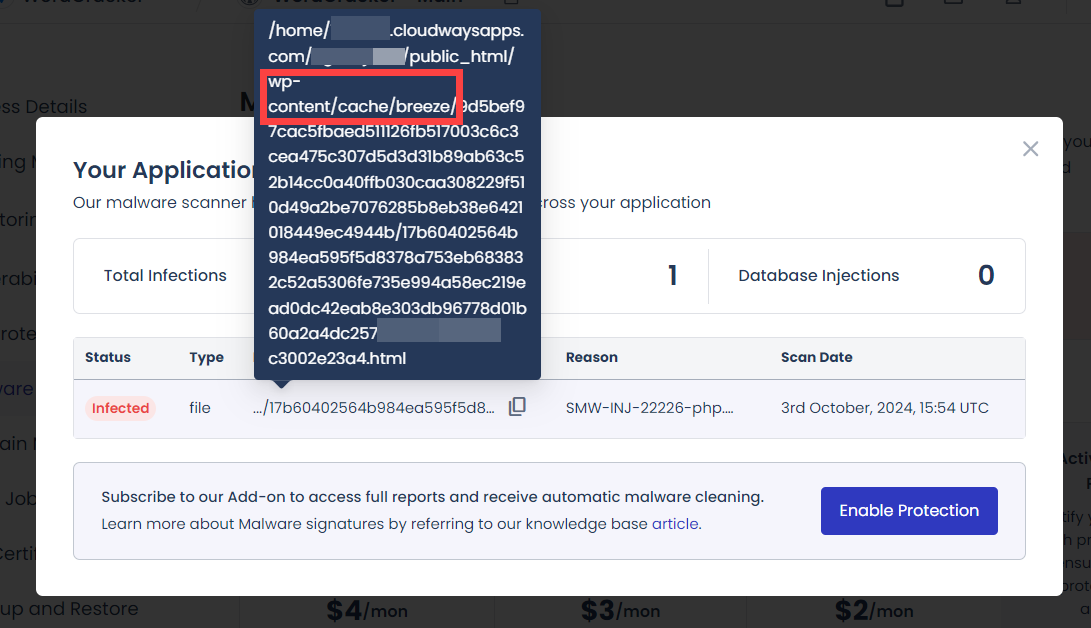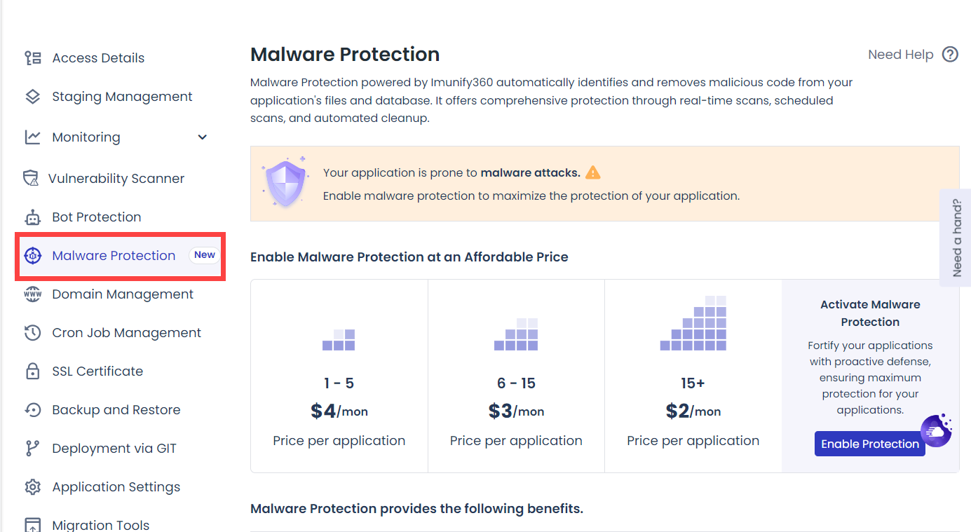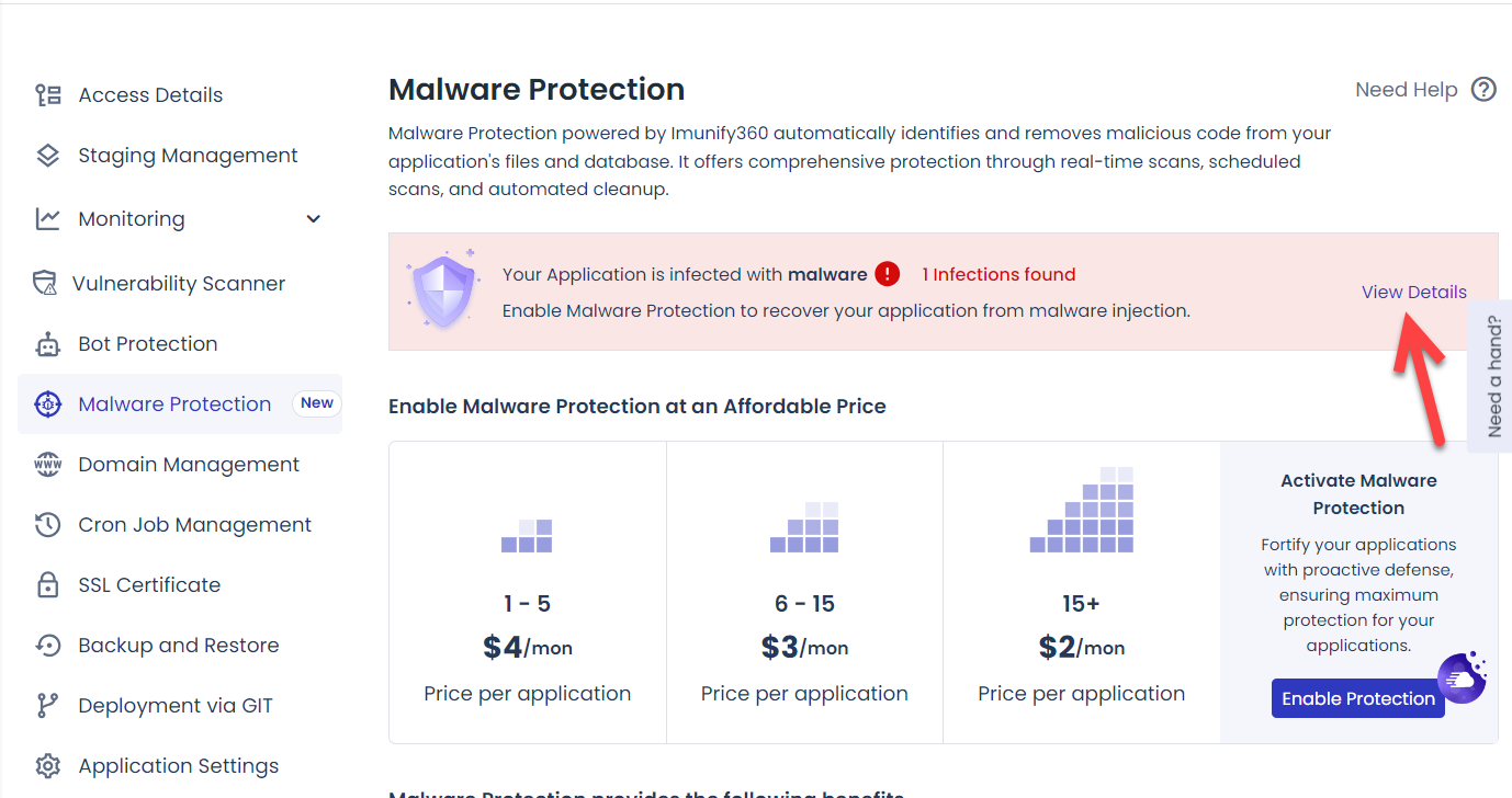 클라우드웨이즈(Cloudways)는 Imunify360을 이용하여 멀웨어를 스캔하여 치료하는 Malware Protection 기능을 추가했습니다. Malware Protection 페이지를 방문하면 해당 애플리케이션에 멀웨어가 있는지 스캔하여 결과를 알려주고, 악성코드에 감염되었을 경우 해당 위치도 표시합니다. 그러나 치료를 하고 싶은 경우에는 Malware Protection 애드온을 활성화해야 합니다. 이 애드온을 활성화하면 월 4달러의 비용이 청구됩니다.