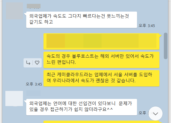 속도와 언어 문제로 인해 접근하기가 쉽지 않았다고 합니다. 저는 해외 업체들이 24시간 연중무휴 라이브 채팅으로 지원을 제공하는 것이 국내호스팅보다는 좋은 것 같습니다. 블루호스트는 해외 업체들 중에서는 고객지원이 조금 안 좋은 편이 속하지 않나 생각됩니다.
