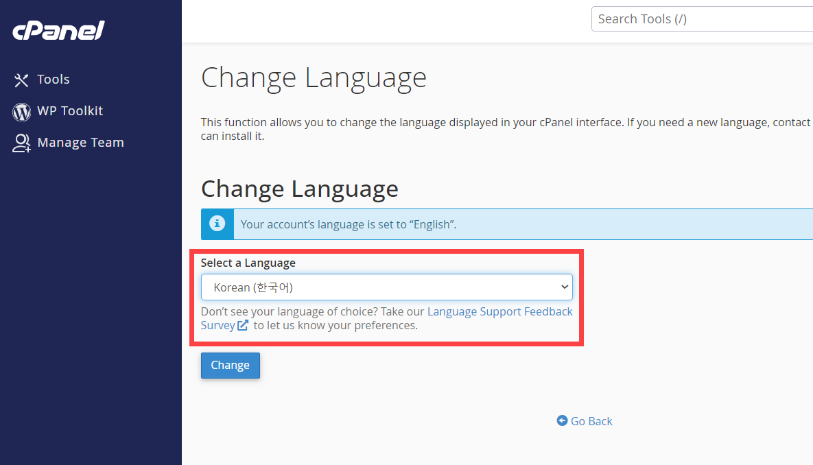 Change 버튼을 누르고 잠시 기다리면 cPanel의 언어가 한국어로 변경됩니다.