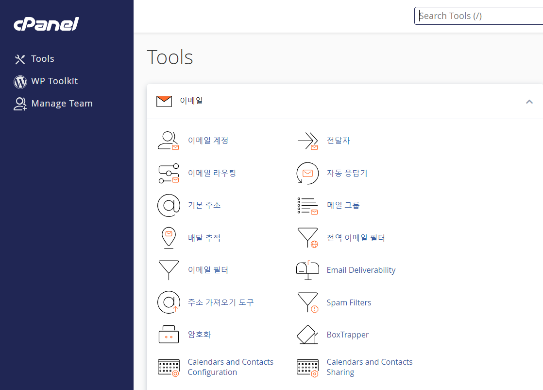 이제 cPanel 툴들의 언어가 한국어로 바뀐 것을 확인할 수 있습니다.