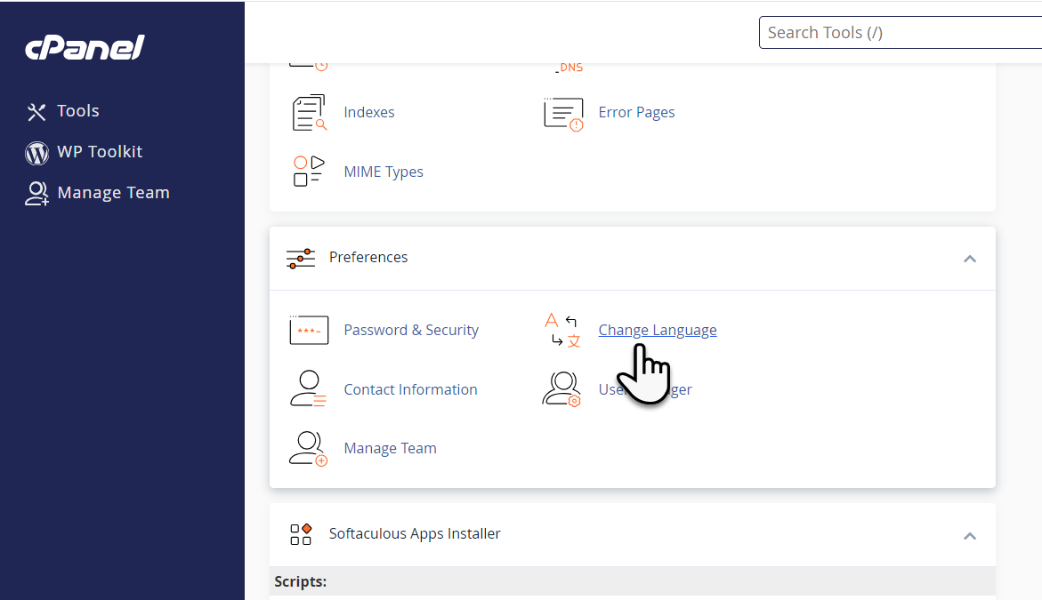 영어에 익숙하지 않은 경우 cPanel 인터페이스 언어를 한국어 등 원하는 언어로 바꾸면 보다 쉽게 cPanel을 이용할 수 있을 것입니다.
