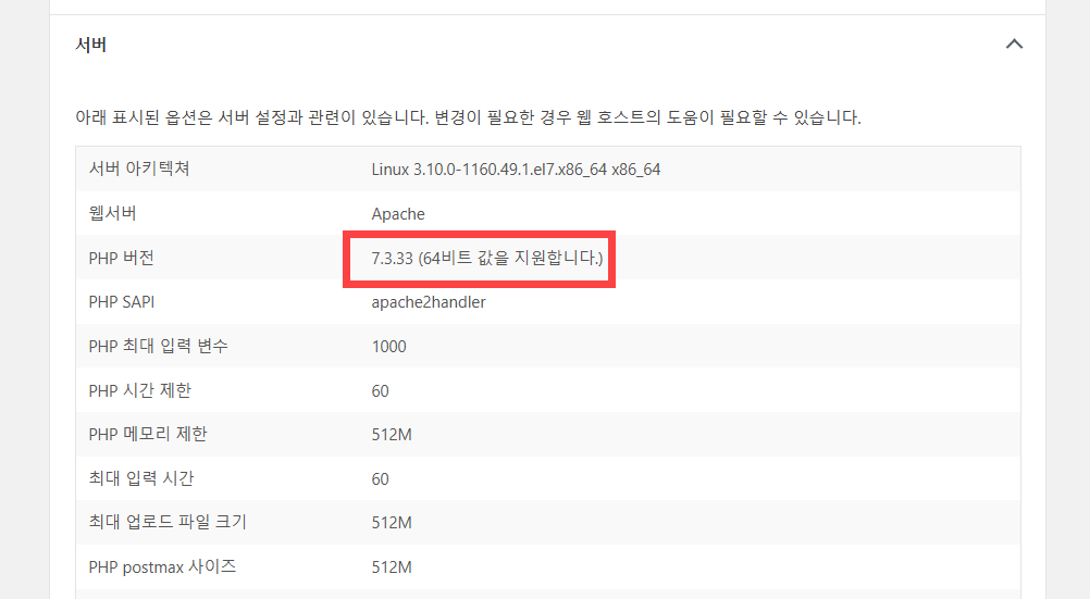 워드프레스 버전이 낮으면 PHP 버전도 낮은 경우가 많습니다. 실제로 해당 사이트의 PHP 버전은 7.3으로 조금 낮은 편이었습니다.