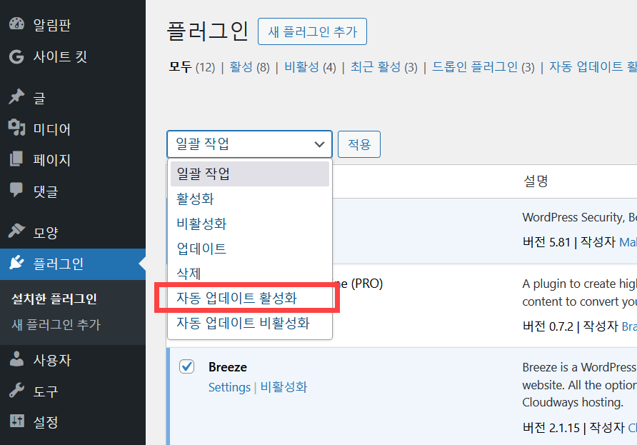 플러그인의 자동 업데이트를 활성화하면 무료 플러그인들은 자동으로 업데이트되므로 편리합니다.