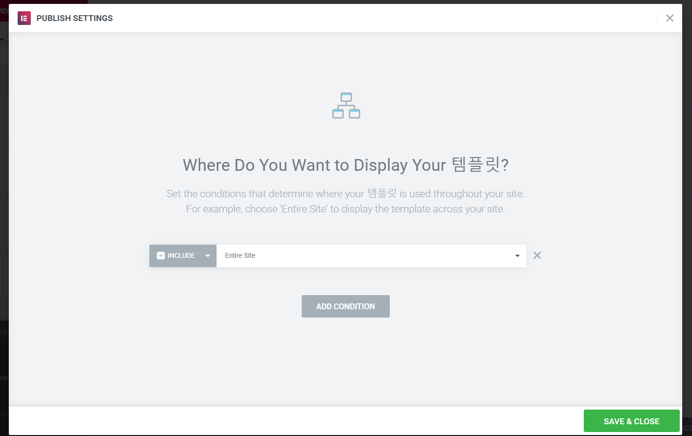 템플릿 편집 화면에서 왼쪽 하단의 Update 옆에 있는 화살표를 클릭하고 Display Conditions(표시 조건)을 눌러 해당 템플릿 표시될 위치가 올바르게 설정되었는지 체크해 보세요.