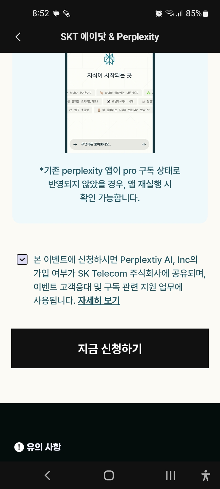 SKT 사용자라면 우선 신청한 후에 사용 여부는 나중에 결정해도 될 것 같습니다. 이달 말까지 신청이 가능하고, 신청 시 Perplexity Pro 1년 구독(29만원 상당)을 무료로 이용할 수 있습니다.