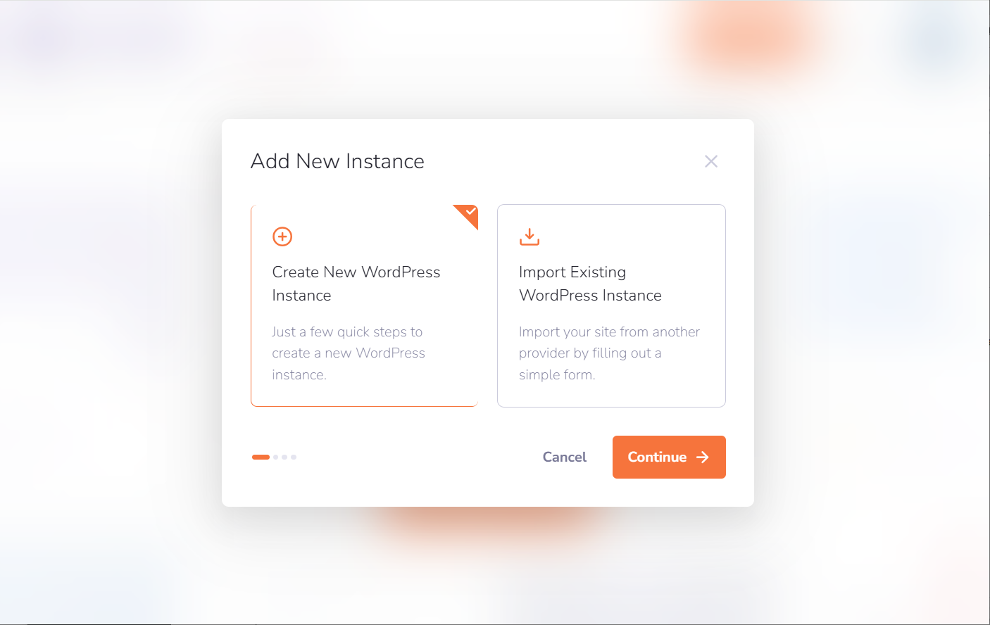 새로운 워드프레스 인스턴스를 만들 것인지, 아니면 기존 워드프레스 인스턴스를 임포트할 것인지 선택하는 팝업이 표시됩니다.