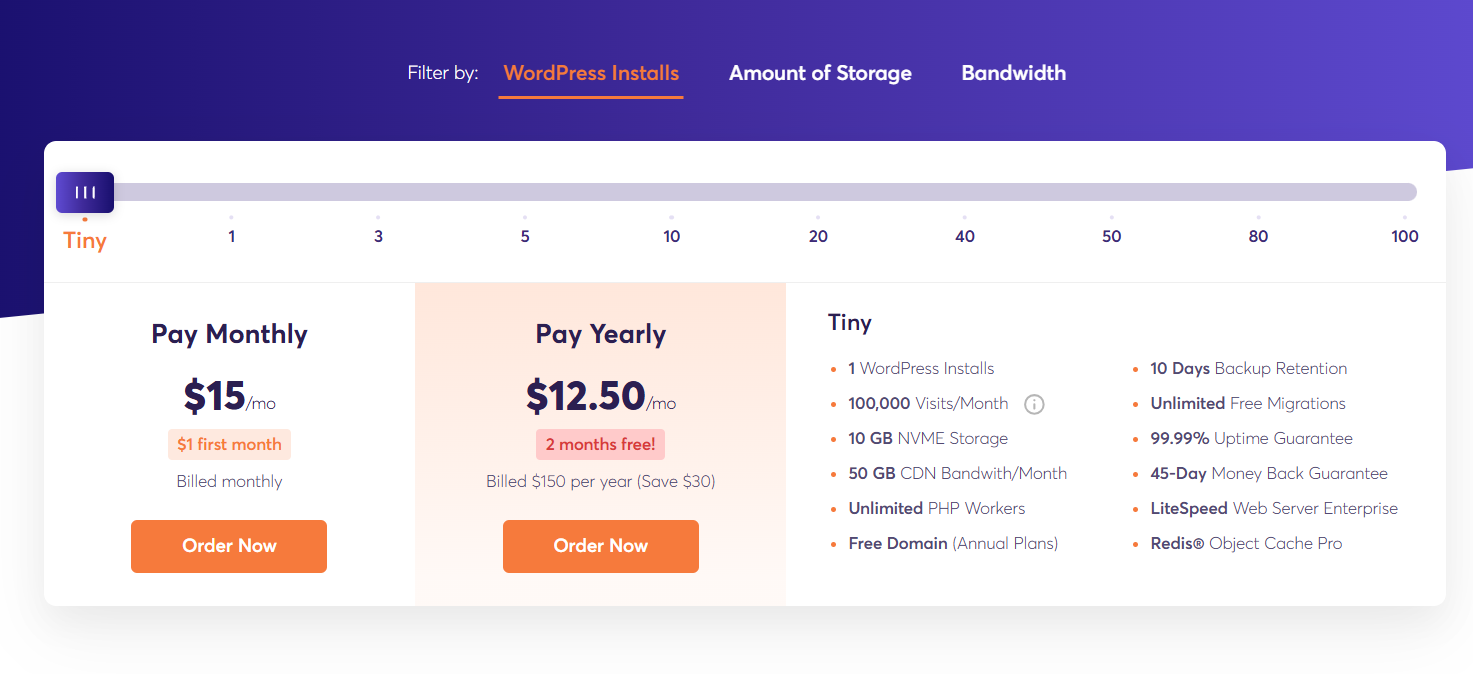매니지드 워드프레스 호스팅은 클라우드웨이즈와 비교하여 더 많은 방문자 수를 감당할 수 있지만 플랜에 따라 설치 가능한 사이트 개수에 제한이 있습니다.