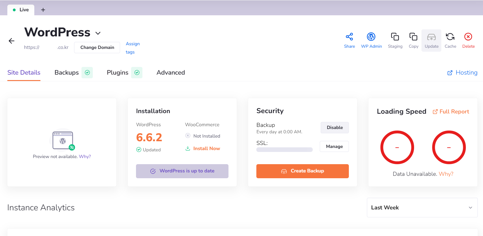Manage Site를 클릭하면 사이트 상세 정보가 표시되고 Backups에서 백업을 관리할 수 있습니다.