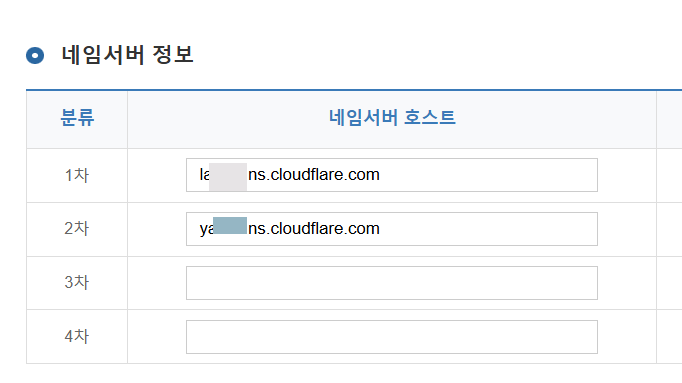 카페24, 가비아, 네임칩 등 도메인 등록업체 사이트에서 도메인의 네임서버를 제시된 정보로 변경하도록 합니다.