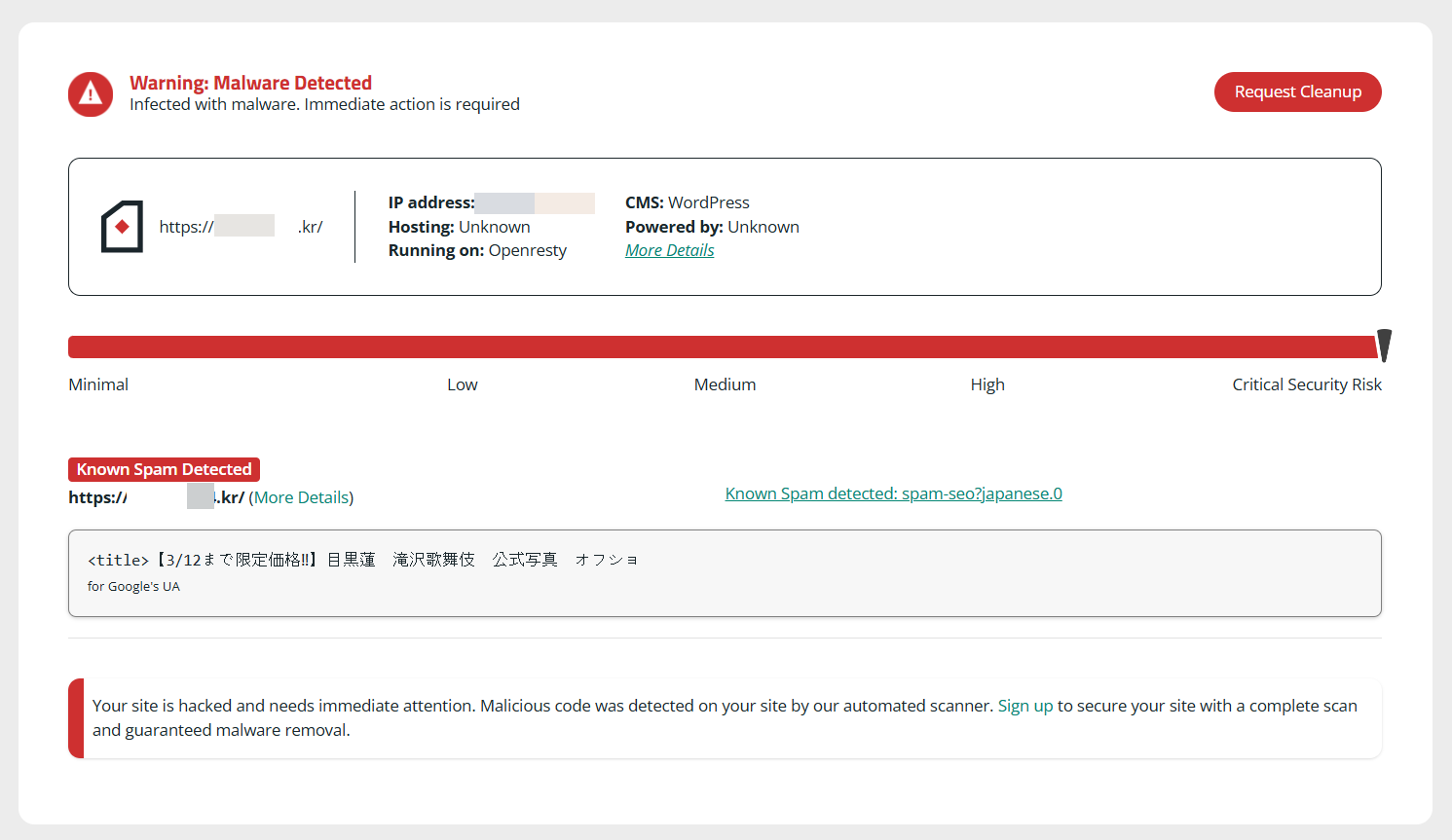 드물지만 사이트가 해킹당하거나 멀웨어에 감염되면서 구글 등 검색엔진에 일본어 콘텐츠가 검색되는 경우가 있을 수 있습니다. 구글에서 워드프레스 사이트 주소를 검색했을 때 일본어 쇼핑 관련 콘텐츠가 노출되는 문제로 클라이언트로부터 연락을 받았습니다.