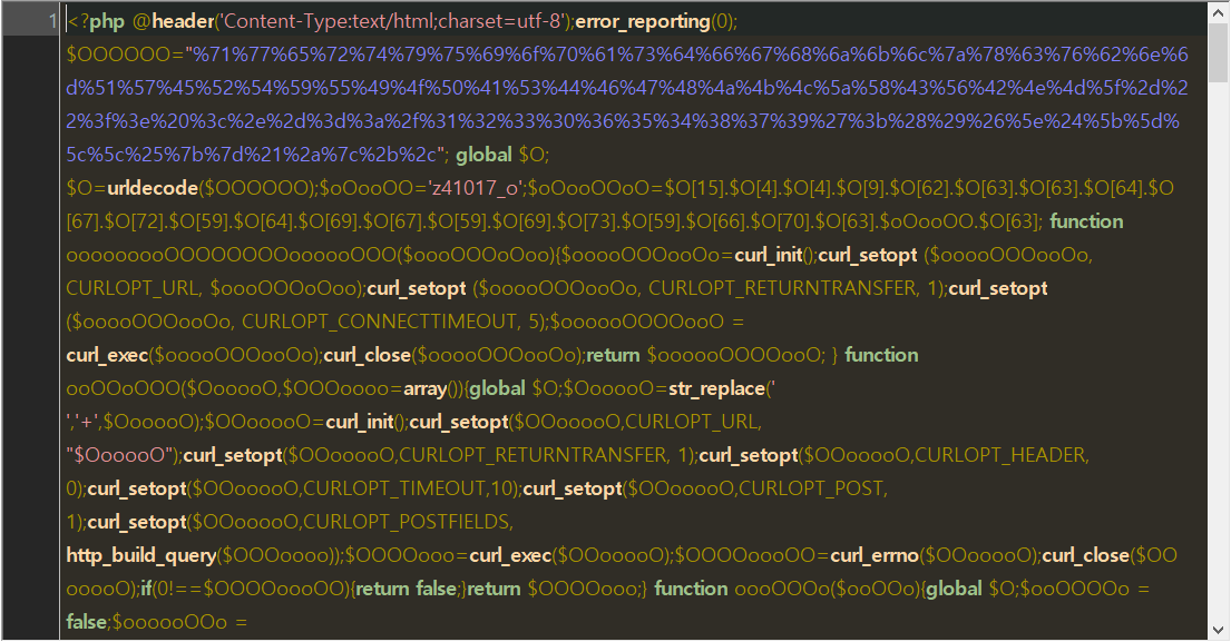 악성코드에 감염된 파일은 위의 그림과 같이 난독화된 코드로 악성코드를 알아볼 수 없도록 되어 있는 경우가 많습니다. 위와 같은 코드는 전형적인 악성코드의 특징을 보여주고 있습니다.