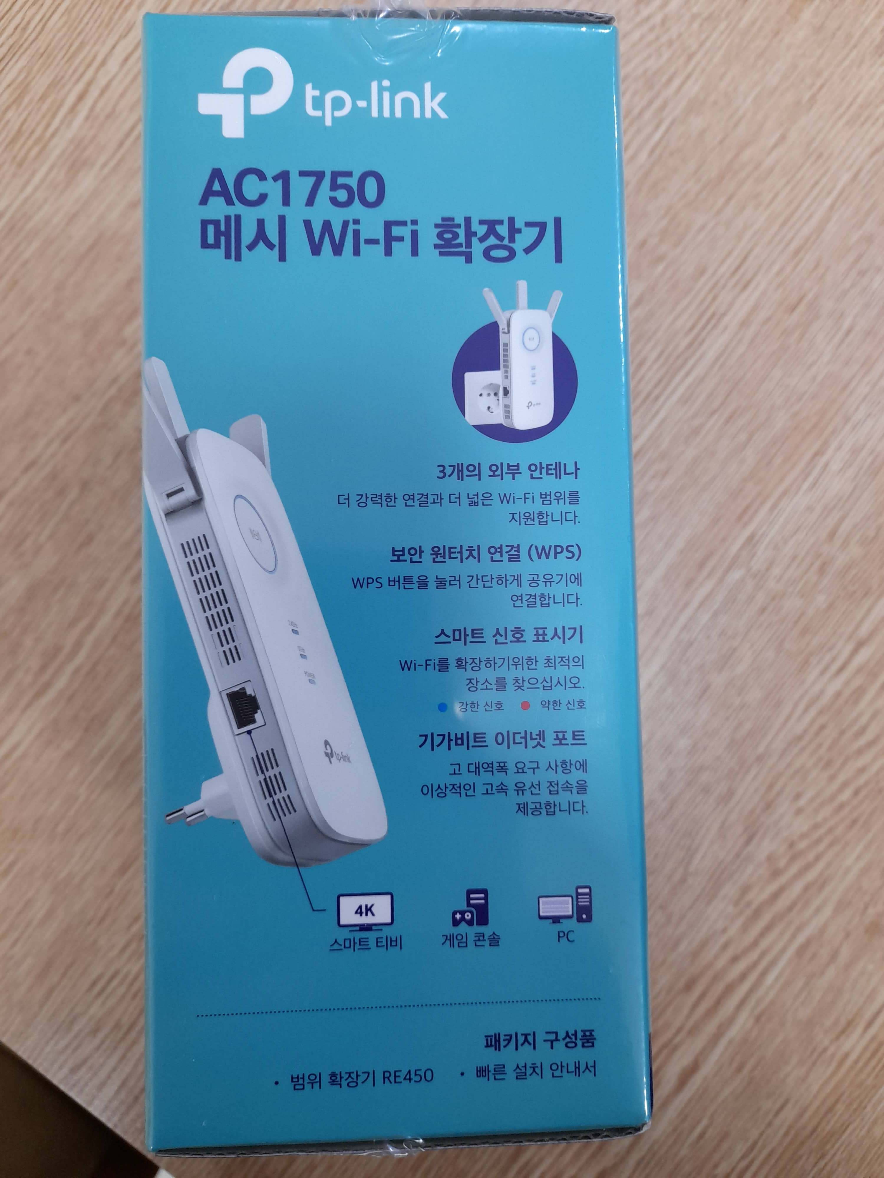 무선 와이파이 증폭기가 급히 필요하여 다른 사용자들의 평가가 좋은 RE450이라는 티피링크 무선 와이파이 증폭확장기를 구입했습니다. 몇 년 전에 저렴한 iptime의 Extener N3를 구입했지만 2.4GHz 신호만 지원하고 5GHz 신호를 지원하지 않아서 별로 만족스럽지 못했습니다. 이번에는 너무 가격이 낮은 제품은 피하고 조금 비싸더라도 평가가 좋은 티피링크 제품을 선택했습니다.