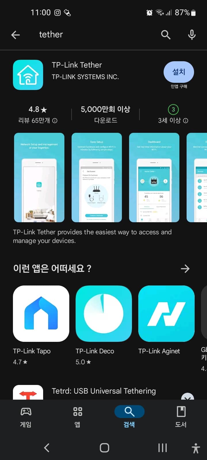 Thether 앱은 애플 App Store나 Google Play에서 검색하여 설치하거나 설치 안내서의 Tether QR 스캔을 통해 곧바로 설치 화면으로 이동할 수 있습니다. 정확한 이름은 TP-Link Tether입니다.