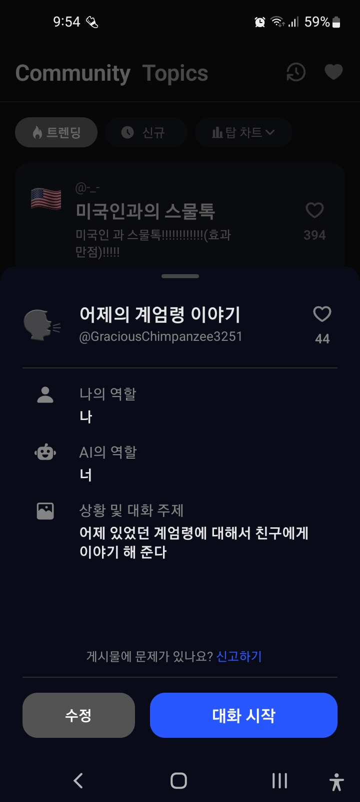 한국어 버전에서만 그런지 모르겠지만, "어제의 계엄령 이야기"라는 주제가 올라왔네요. "미국인과의 스몰톡" 같은 주제를 선택하면 자유 주제로 미국인과 이야기를 나눌 수 있습니다.