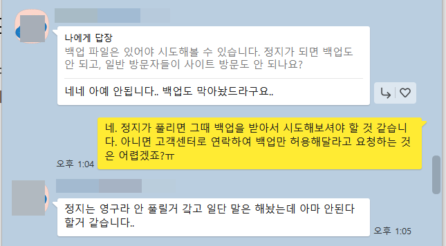 백업본도 없고 일반 사용자들이 블로그에 방문할 수 없는 상태라면 카카오 고객센터에 연락하여 정중하게 영구 정지를 풀어달라고 공손하면서도 논리적으로 부탁하거나 혹은 풀어주거나 백업을 받을 수 있도록 해달라고 읍소하는 방법 외에는 딱히 사이트를 살릴 방법은 없을 것으로 보입니다.