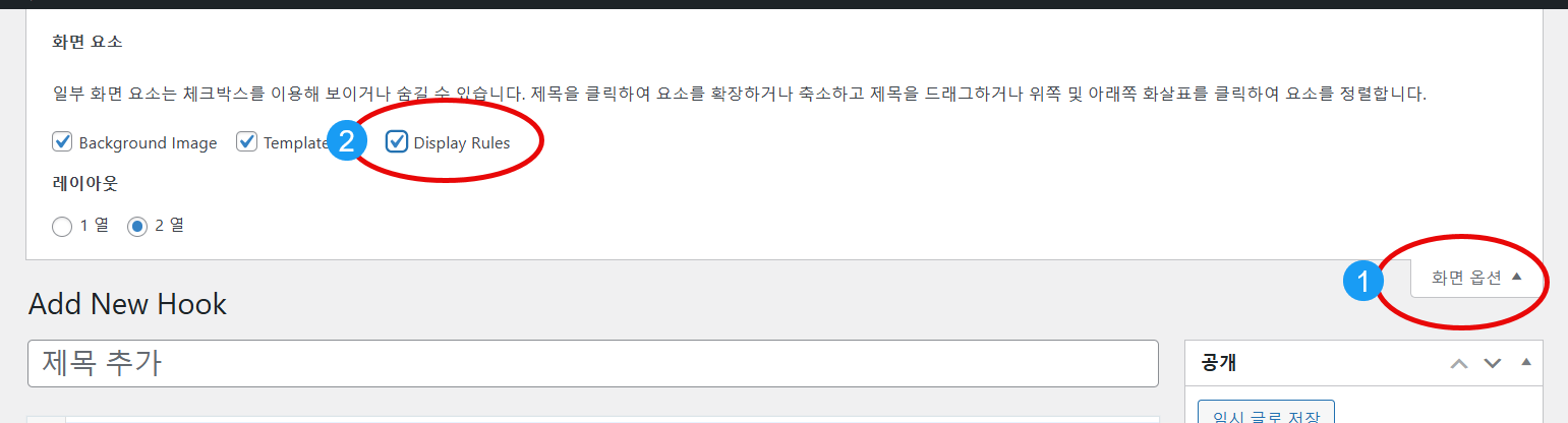 이 경우 오른쪽 상단의 화면 옵션을 클릭하고 Display Rules 화면 요소가 체크되어 있지 않다면 체크하도록 합니다.