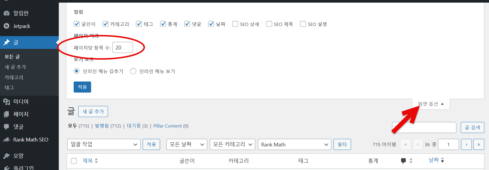예를 들어, 글 » 모든 글에서 한 화면에 나열되는 포스트 개수를 화면 옵션에서 변경할 수 있습니다.