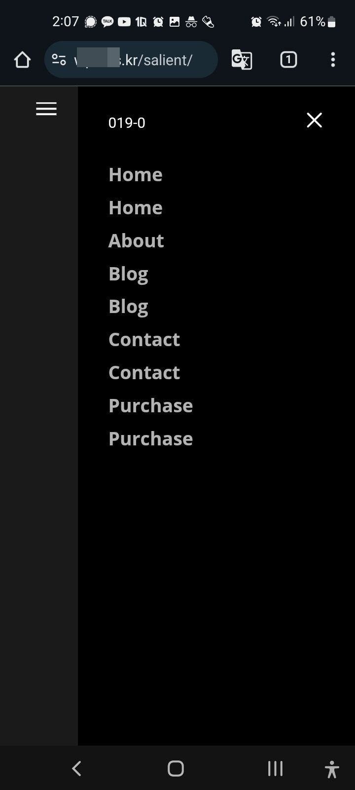 Salient 테마를 사용하는 경우 모바일 기기에서 햄버거 메뉴를 클릭하면 아래 그림과 비슷한 형식으로 오프 캔버스 메뉴가 표시됩니다.