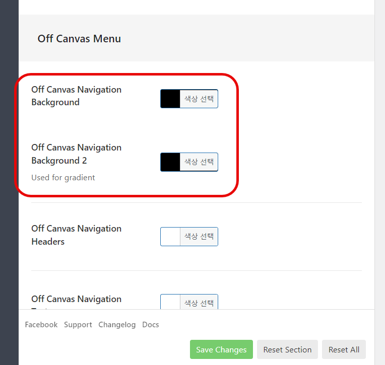Off Canvas Navigation Background (오프 캔버스 내비게이션 배경) 컬러를 변경하도록 합니다. Off Canvas Navigation Background 1과 Off Canvas Navigation Background 2 두 가지 옵션이 있습니다. 그라디언트 배경색을 원하는 경우 배경색 1과 배경색 2를 적절히 설정합니다.