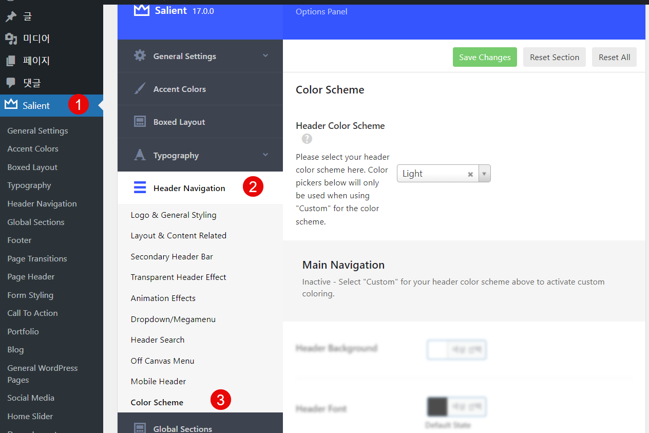 만약 위의 그림과 같이 일부 옵션을 변경할 수 없도록 잠겨 있는 경우에는 Header Color Scheme을 Custom (사용자 정의)으로 변경하도록 합니다.