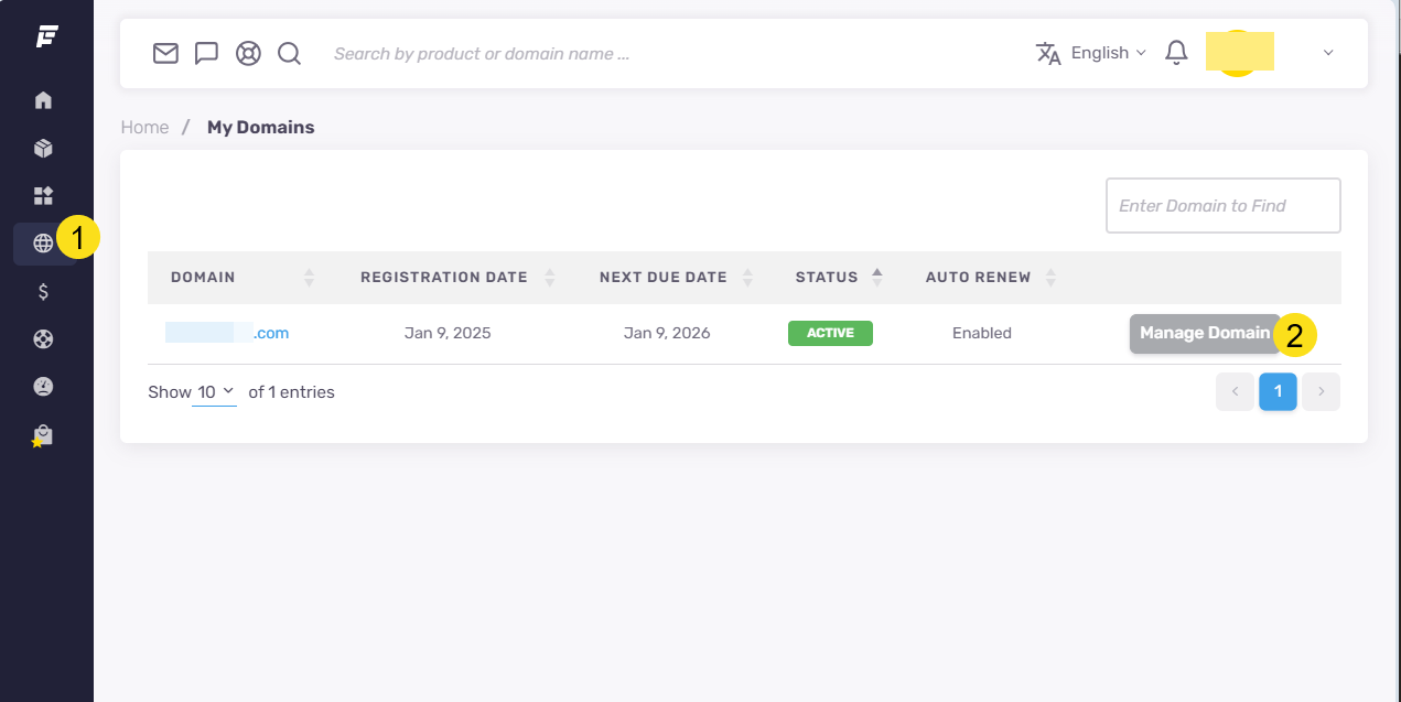 도메인의 네임서버를 변경하려면 FastComet에 로그인한 다음, 도메인 관리 페이지로 이동하여 네임서버를 변경할 도메인의 맨 오른쪽에 있는 Mange Domain 버튼을 클릭합니다.