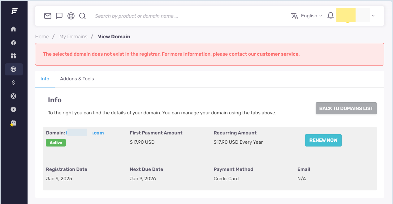 드물지만 도메인 아이콘을 클릭했을 때 "The selected domain does not exist in the registrar" (선택한 도메인이 도메인 등록기관에 없습니다) 오류가 발생할 수 있습니다.