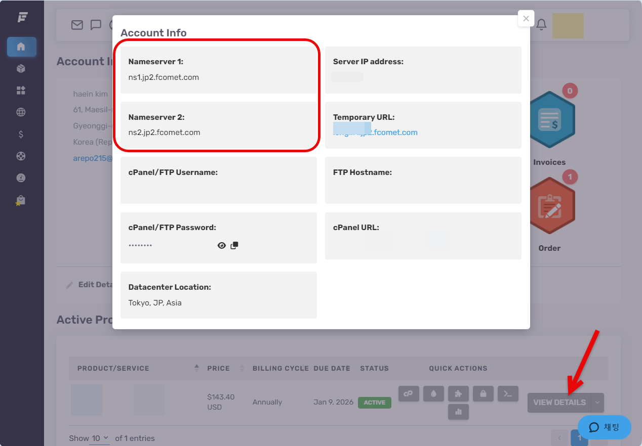 패스트코멧의 네임서버 정보는 상품 페이지에서 해당 호스팅 상품의 맨 오른쪽에 있는 View Details 버튼을 클릭하여 확인할 수 있습니다.