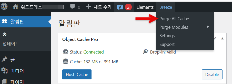 클라우드플레어에서 제공하는 Breeze 캐시 플러그인을 사용하는 경우 Breeze에서 Purge All Cache를 클릭하여 모든 캐시를 삭제하면 클라우드플레어 캐시까지 삭제됩니다.