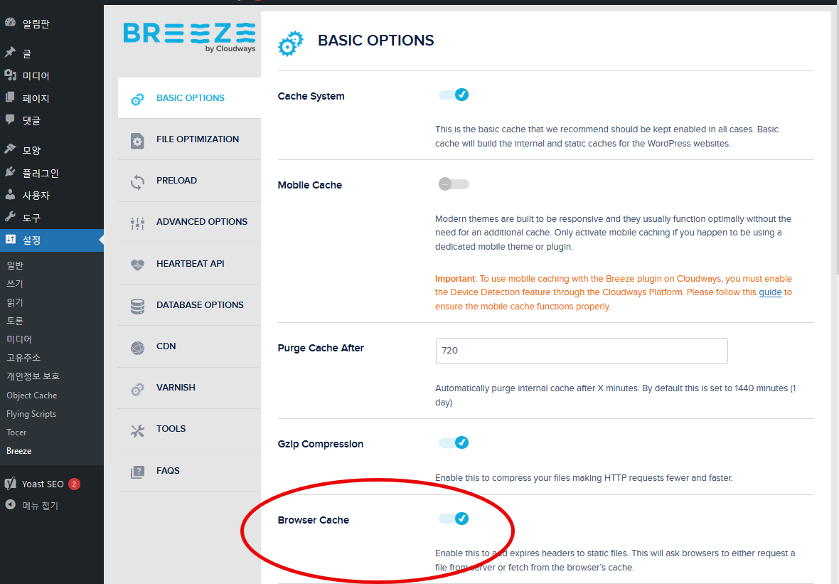 Breeze 플러그인을 사용하는 경우 설정 » Breeze » BASIC OPTIONS (기본 옵션) 페이지에서 Brower Cache를 활성화/비활성화할 수 있습니다.