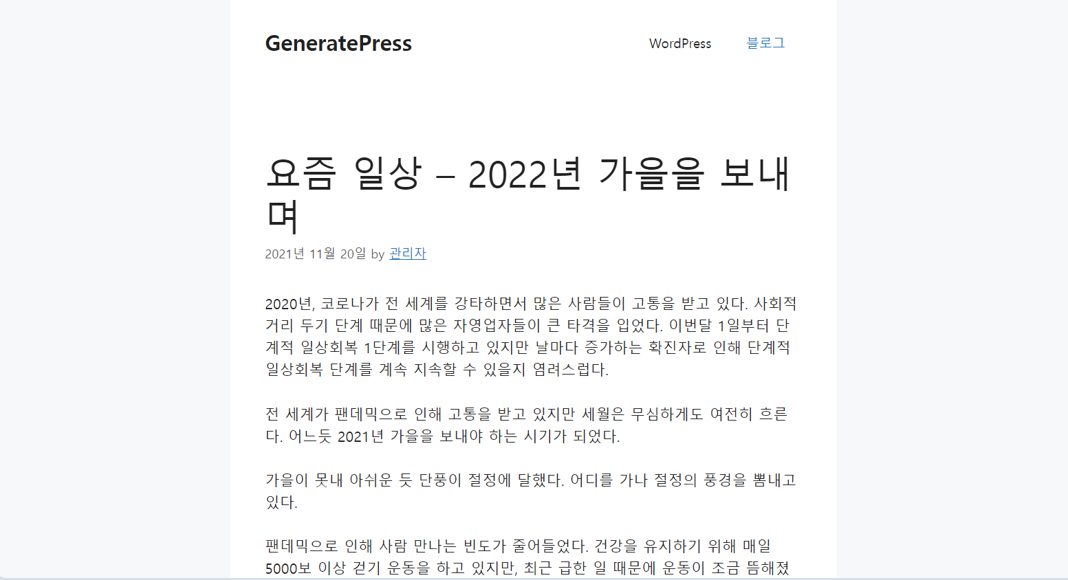 워드프레스 테마 중에서 GeneratePress 테마가 속도가 빠르고 커스텀하기에 좋아서 저는 거의 대부분 사이트에 이 테마를 사용하고 있습니다. 이 테마를 사용하는 사이트/블로그가 점차 늘어나는