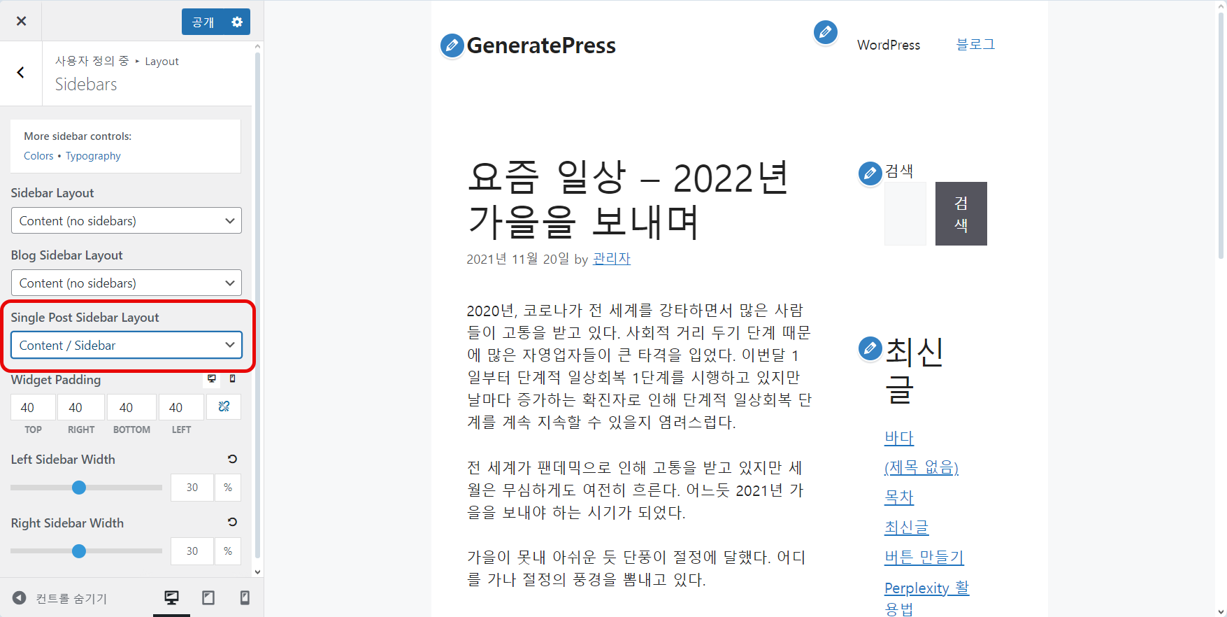 GeneratePress 테마에서 위의 그림과 같이 설정하는 방법에 대하여 살펴보겠습니다.