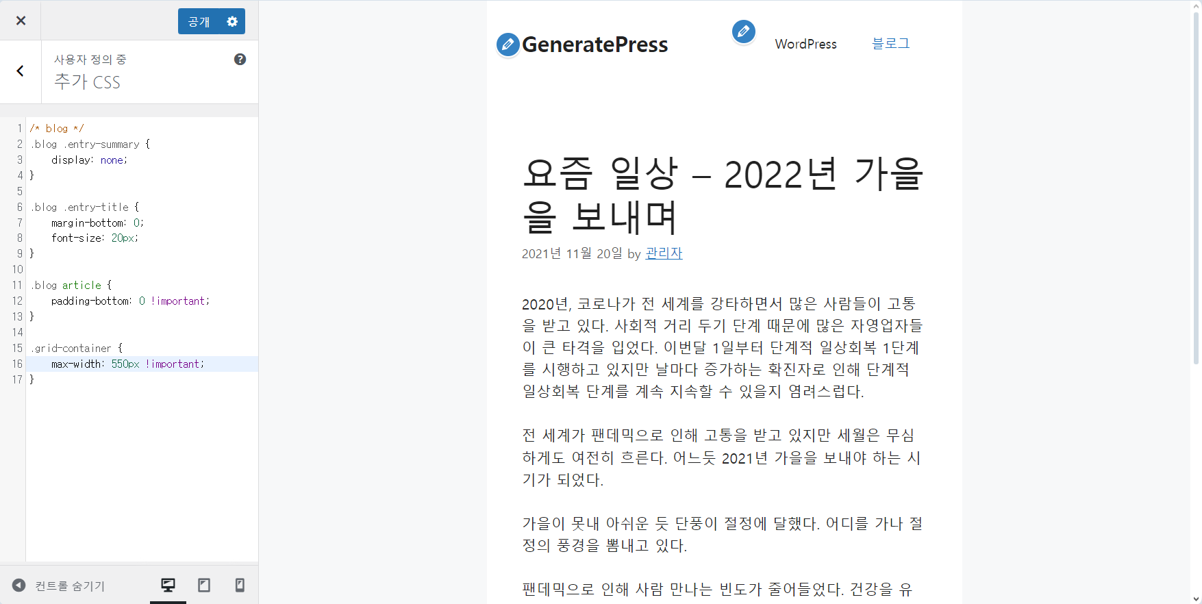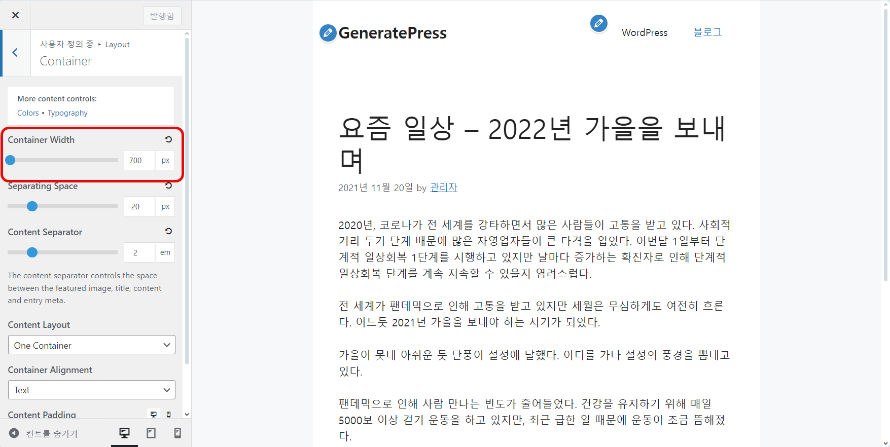 워드프레스 GeneratePress 테마: 콘텐츠 폭을 조정하는 방법 (PC 레이아웃을 모바일 레아아웃과 동일하게 설정하기)