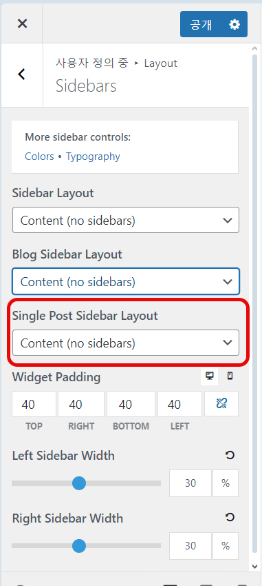 블로그 글에서만 사이드바를 제거하려면 Single Post Sidebar Layout의 옵션을 Content (no sidebars)를 선택합니다.
