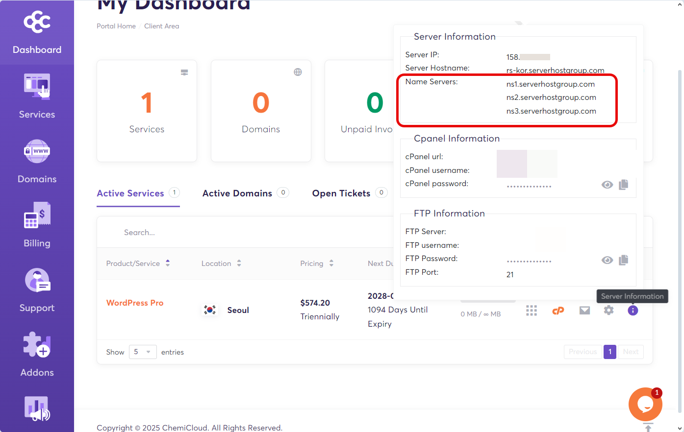 케미클라우드의 네임서버는 Dashboard » Active Services 탭에서 해당 상품의 맨 오른쪽에 있는 Server Information 아이콘을 클릭하여 확인할 수 있습니다.